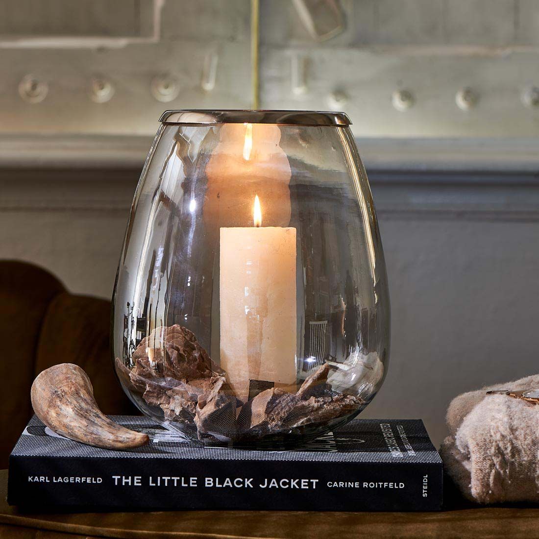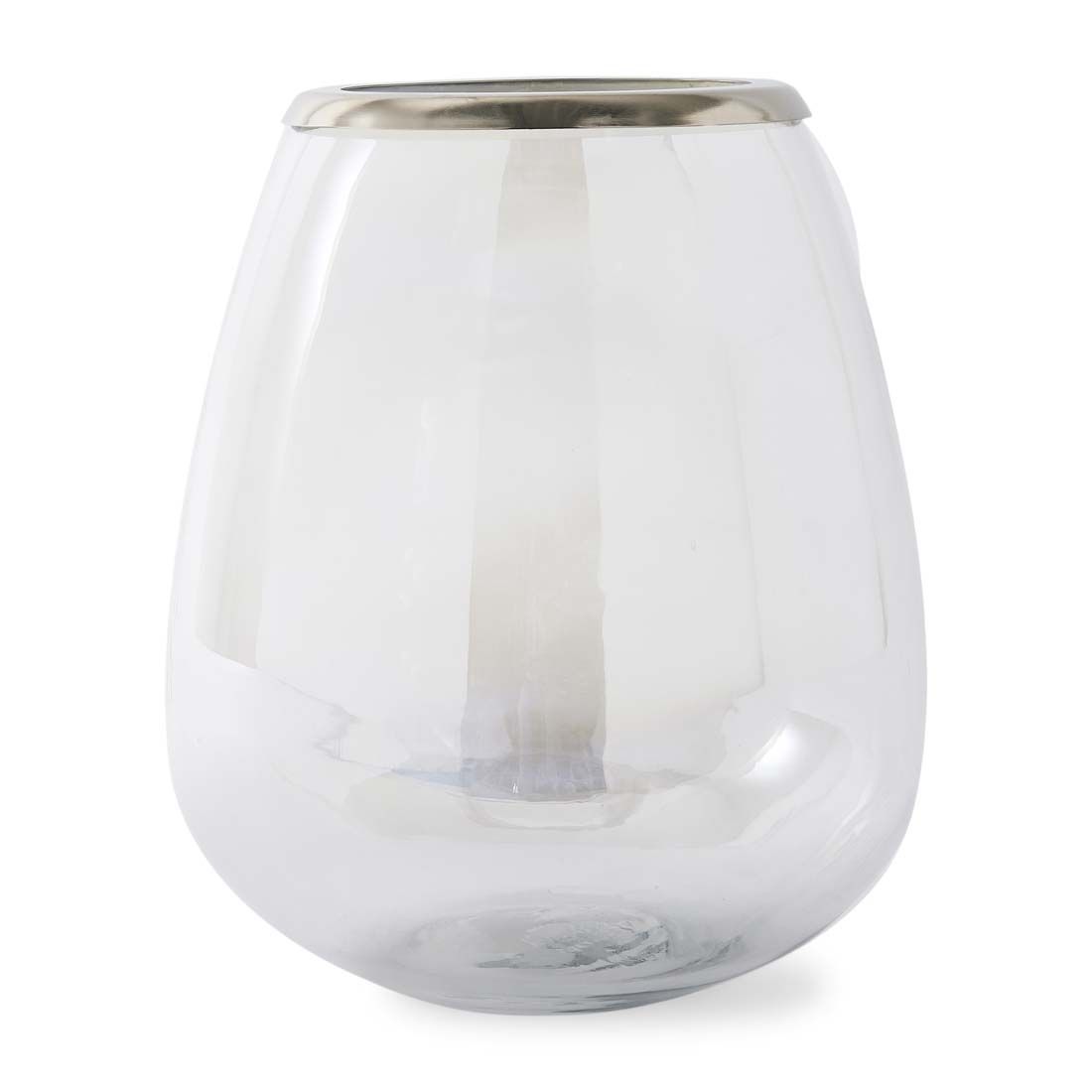 Dieses wunderschöne, große Windlicht aus Glas hat einen eleganten Aluminiumrand sowie eine zusätzliche Perlmutt-Schicht, die es mit und ohne brennende Kerze noch besser erstrahlen lässt. In dieses Windlicht können Sie auch hervorragend Blumen geben, aber nur solche, die ohne Wasser auskommen, da die Perlmutt-Schicht nicht wasserdicht ist.