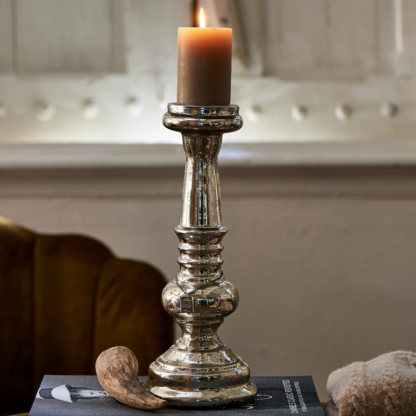 Ein toller, großer Kerzenhalter, ideal für Stumpenkerzen, dessen Charme im angelaufenen Silber-Look sehr moderne Akzente setzt.