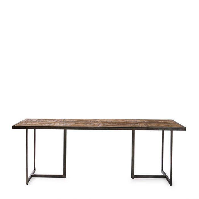 Dieser robuste Esszimmertisch eignet sich perfekt für ausgedehnte, gesellige Mahlzeiten im Freundes- und Familienkreis. Die Tischlänge beträgt 220 cm und damit passen jeweils drei Stühle an den Seitenbereich und ein Stuhl an den Kofbereich des Tisches. Der vielseitige Tisch ist aus recyceltem Eschen- und Eichenholz gefertigt. Die Intarsien wurden per Hand in die Tischplatte eingelegt und zeugen von fachmännischem, handwerklichem Können. Das eiserne Untergestell verleiht dem Tisch einen markanten, zeitgemäßen Look.